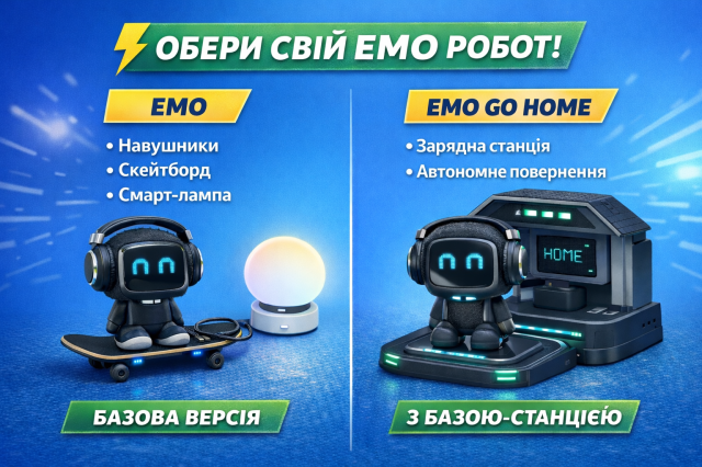 - EMO стандартний (чорний) – інтерактивний робот для дому та офісу, з емоційним дисплеєм і штучним інтелектом. Може кататися на скейтборді та взаємодіяти зі смарт-лампою.